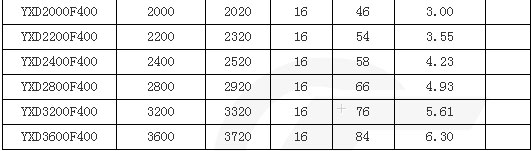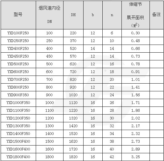 ?。?)YXDB800F250表示圓形非金屬補償器,長期工作≤200°C,內徑為DN800mm,法蘭連接補償器長度250mm。